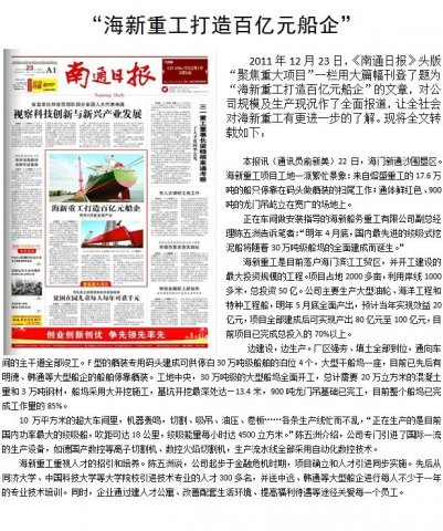 2011年10月14日,江蘇海新船務重工有限公司與上海交通大學船舶海洋與建筑工程學院設立學生活動贊助金和實踐基地簽約儀式在上海交通大學舉行。簽約儀式上,上海交大船舶海洋與建...