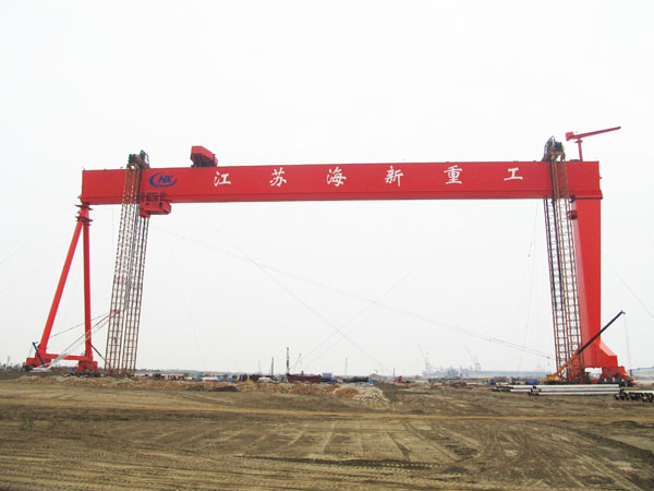 江蘇海新船務重工有限公司900T龍門吊經過23天的提升,,于2012年1月9日順利提升到位。龍門吊總高為112米(含維修小車),主梁下高度為80米。預計1月15號左右鋼腿與主梁焊接完成,春...